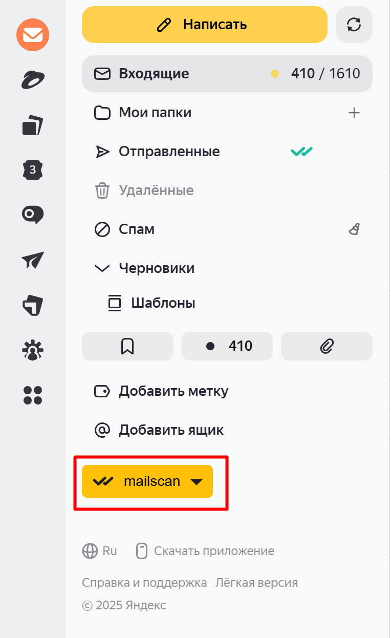После установки в интерфейсе Яндекс Почты появится кнопка Mailscan. Нажмите на картинку ниже, чтобы посмотреть, где именно находится кнопка в интерфейсе Яндекс Почты: